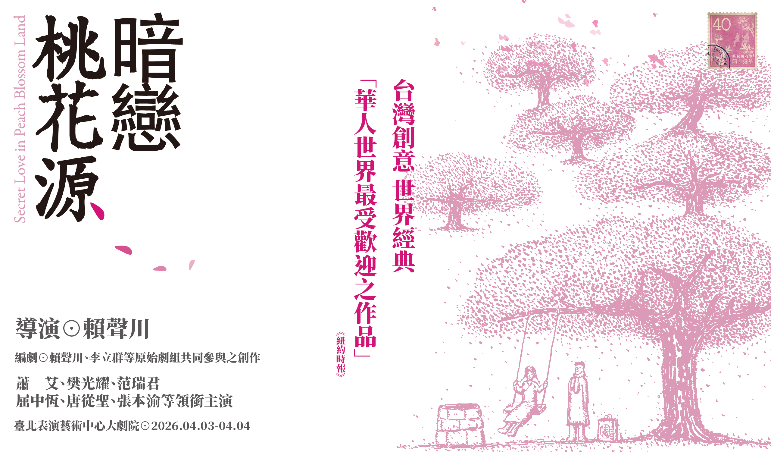 這一朵遍開華語劇場最奇異的一朵花,1986年由賴聲川發想規劃,並率同李立群、金士傑、丁乃竺、顧寶明、劉靜敏(現名劉若瑀)、金士會、管管、陳玉慧、游安順、施心慧、蘇婉玲等人在陽明山所完成之經典作品,演出至今深獲好評,紐約時報稱此劇為「華人世界最受歡迎之作品」;1991年、1999年、2006年、2016年曾四度重返舞台,1992年電影版更打破劇場框架被拍攝成電影,國際上獲獎無數;2015年美國奧勒岡莎士比亞戲劇節以世界經典之名,推出80場英文版《暗戀桃花源》,演出後深獲好評,此舉亦創下華人劇場新里程碑。2026年再於臺北表演藝術中心加演,延續《暗戀》風潮。